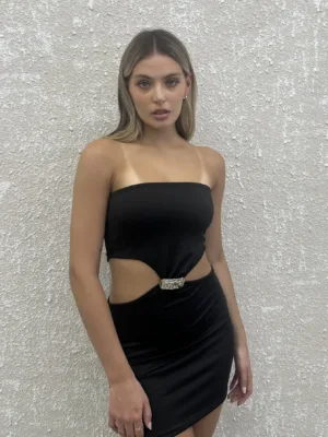 VESTIDO STRAPLES CON ABERTURAS LATERALES Y APLIQUE