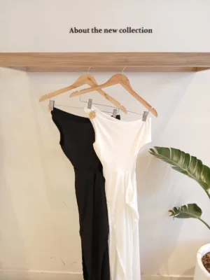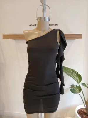 VESTIDO UN HOMBRO CON VOLADO COLGANTE.