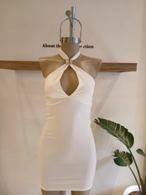 $12,900.00VESTIDO ESCOTE BUCHE CON TIRAS CRUZADAS PARA ATAR EN ESPALDA Y TAJO EN FALDA.