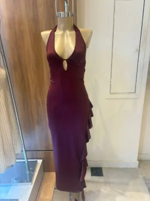 $11,900.00VESTIDO LARGO HALTER “SWEET CANDY” CON GOTA, TAJO Y VOLADOS LATERALES
