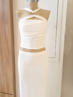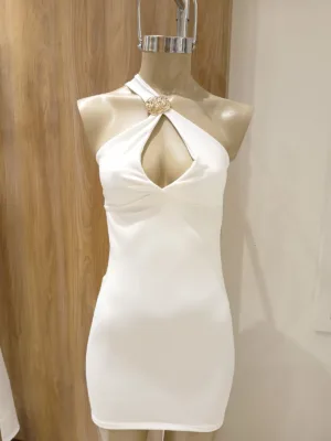 $7,900.00VESTIDO CON TIRAS PARA ATAR EN EL CUELLO, APLIQUE Y GOTA EN ESCOTE