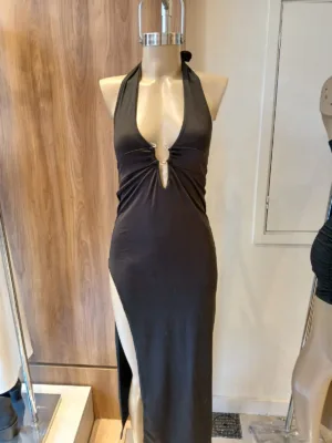 $13,900.00VESTIDO LARGO CON TIRA HALTER PARA ATAR, TAJO LATERAL Y APLIQUE SERPIENTE