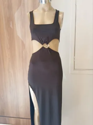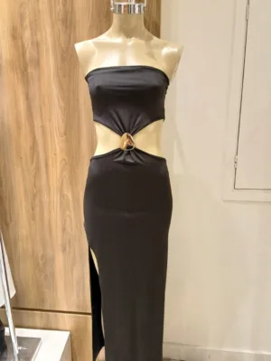 $14,600.00VESTIDO LARGO CUELLO MARILYN BUCHE Y TAJO AL COSTADO