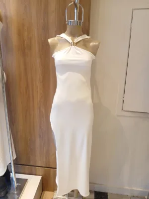 $13,900.00VESTIDO LARGO CON TIRA HALTER PARA ATAR, TAJO LATERAL Y APLIQUE SERPIENTE