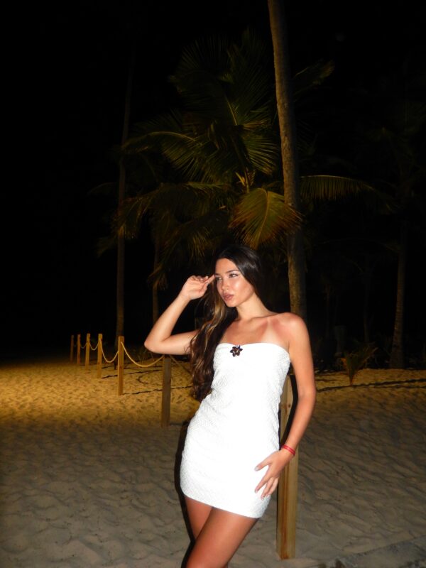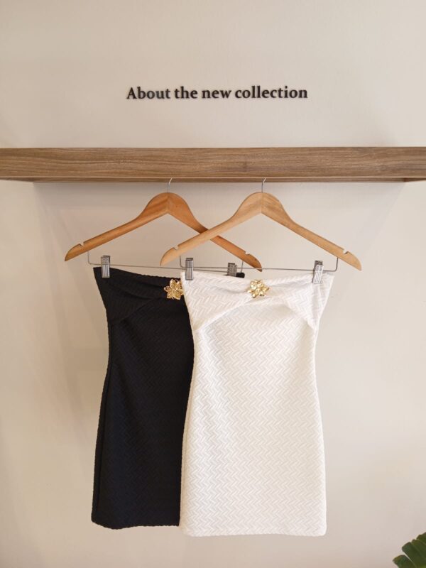 VESTIDO STRAPLESS “SOFT HONEY” CON SOLAPA Y APLIQUE