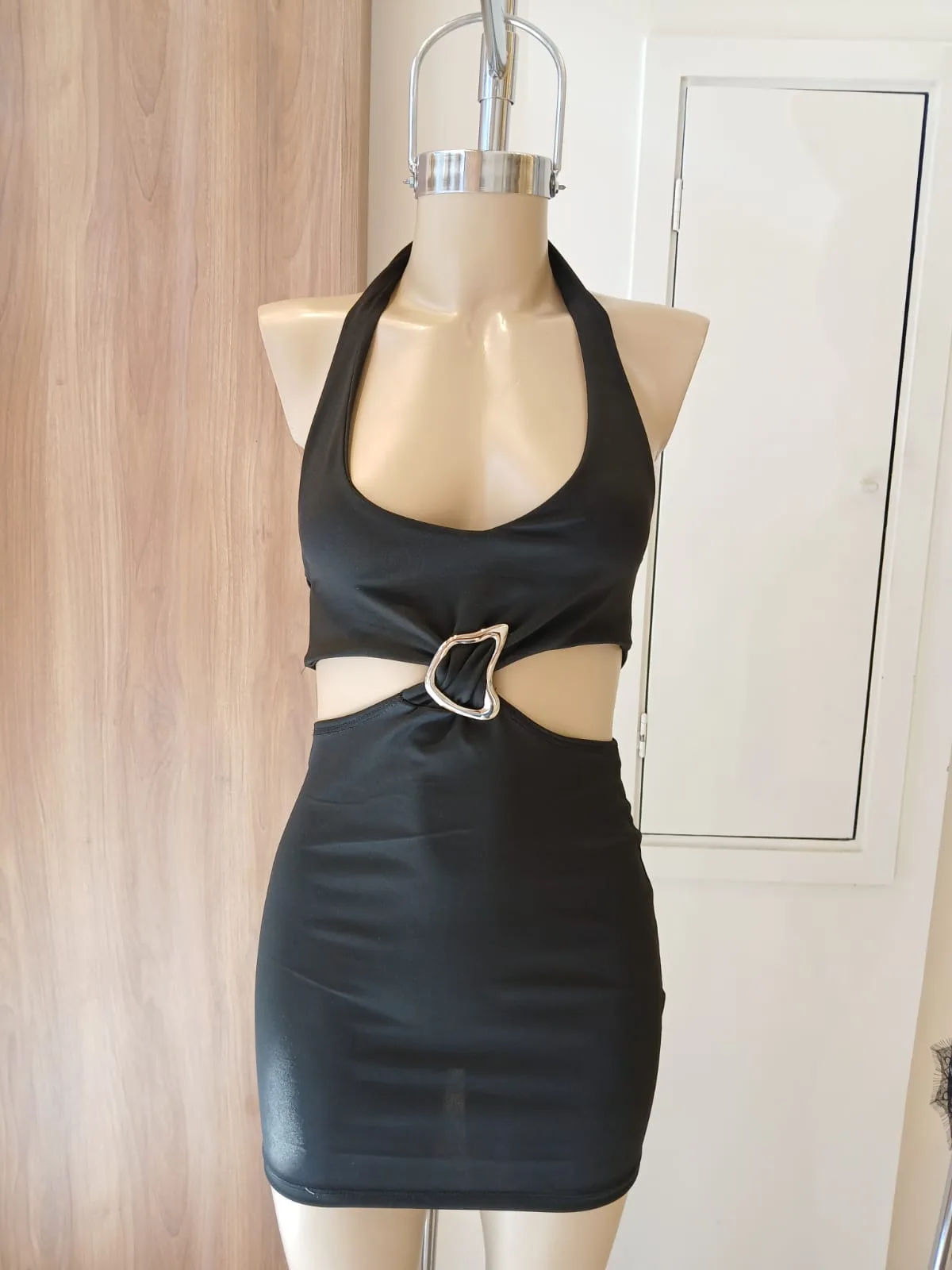 VESTIDO HALTER, CON ABERTURAS LATERALES Y APLIQUE NUBE