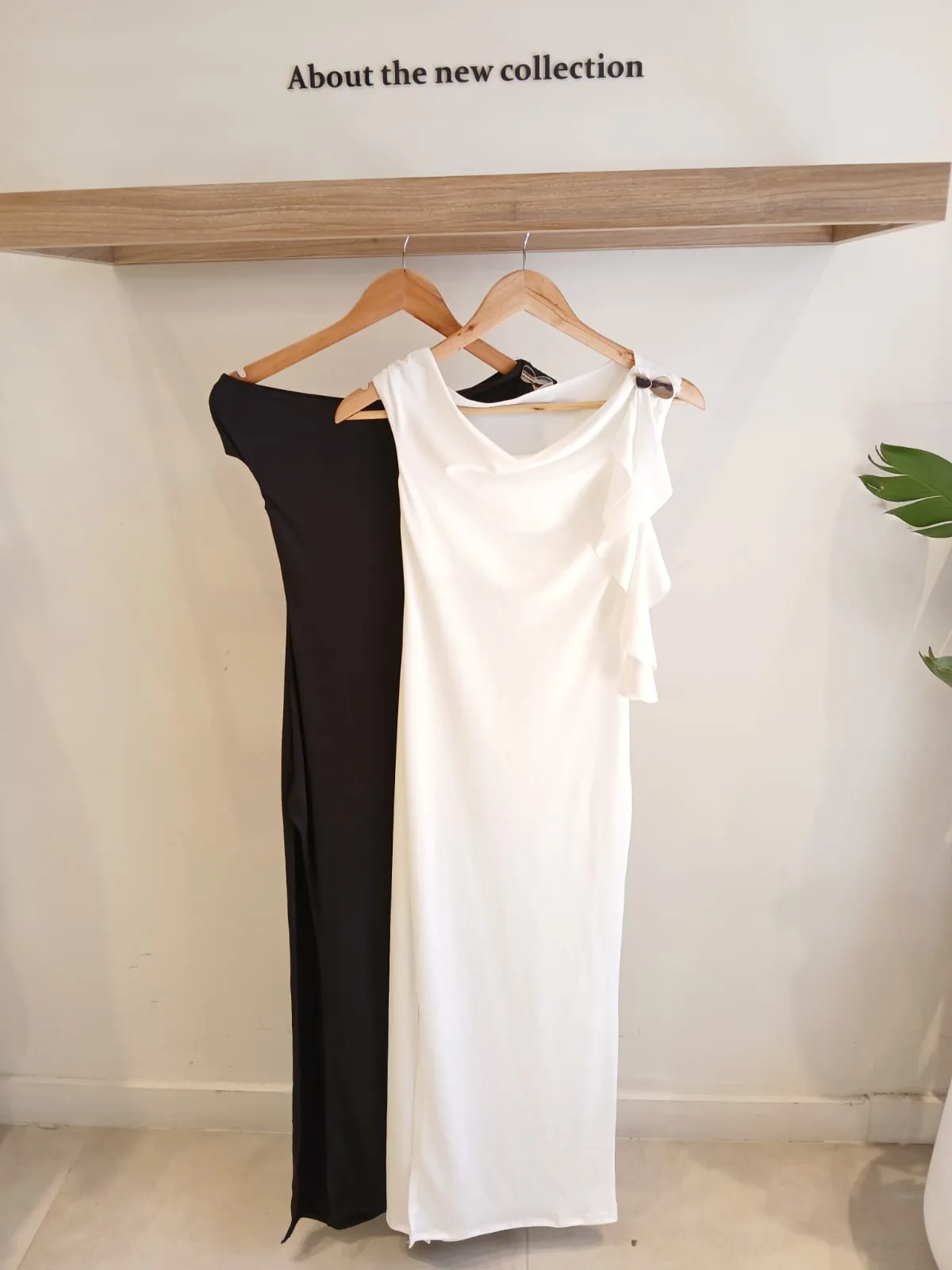 VESTIDO LARGO CON UN HOMBRO TORSADO, VOLADO COLGANTE Y APLIQUE.