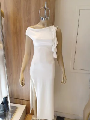 VESTIDO LARGO CON UN HOMBRO TORSADO, VOLADO COLGANTE Y APLIQUE.